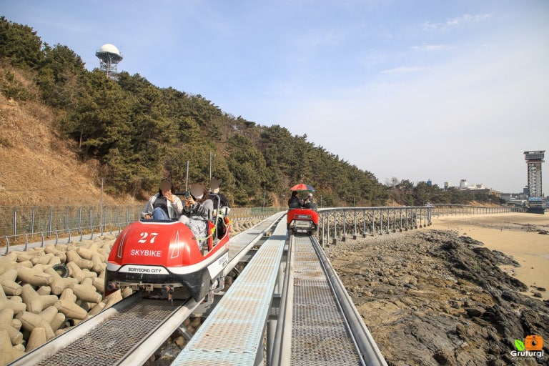 대천해수욕장의 명물! 국내 최초로 바다 위에 설치된 스카이바이크는 대천해수욕장에서 대천항까지 왕복 2.3km를 달리는 해상 레일바이크입니다.