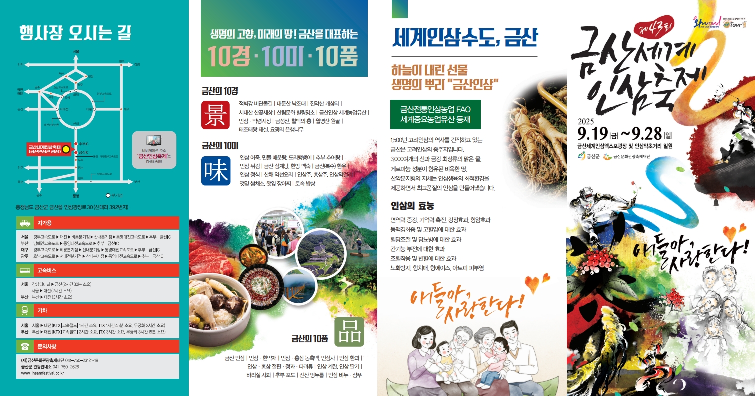 넷째, 금산읍 주변에는 한식당과 전통찻집이 많아 축제를 즐긴 뒤 가족 외식으로 하루를 마무리하기 좋습니다. 예를 들어 금산읍 내 **삼삼한 인삼삼계탕집**에서는 인삼을 아낌없이 넣은 삼계탕을 맛볼 수 있어 축제 관람 후 건강식을 즐기기에 좋습니다. 또 다른 추천은 **금산 인삼한정식당**으로, 다양한 인삼 요리를 코스로 제공해 특별한 외식을 원하는 분들에게 안성맞춤입니다. 결론적으로 금산세계인삼축제는 금산의 자부심과 전통을 엿볼 수 있는 행사이자, 방문객들에게는 특별한 체험과 추억을 선물하는 축제입니다. 2025년 축제에 참여한다면 단순한 관광을 넘어, 건강과 문화를 함께 경험하는 의미 있는 시간이 될 것입니다.